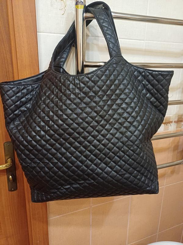 сумка - шопер великого розміру з еко-шкіри. Стан добрий, але є невеликі заломи в двох місцях ( майже не видні), на однієї ручці теж нюанси( на третьому фото). Довжина ручок 42, від них до сумки- 18 см. Інші заміри на фото Є великий відділ, розділений відділом зі змійкою. Також має внутрішні бокові кишені: з замком та без замка. Дуже вістка. Легка, багато потрібного можна вмістити)))