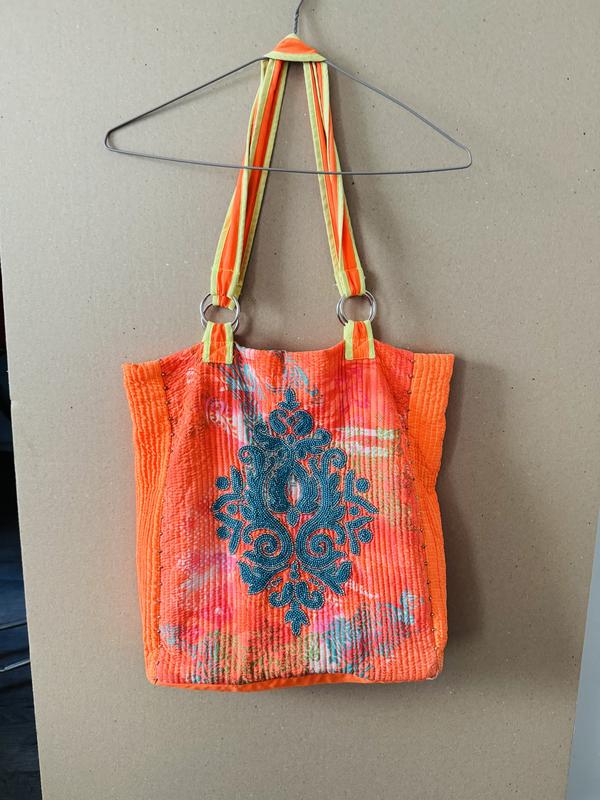 Текстильная сумка на длинной ручке ярко оранжевая орнамент бисер шоппер сундучка