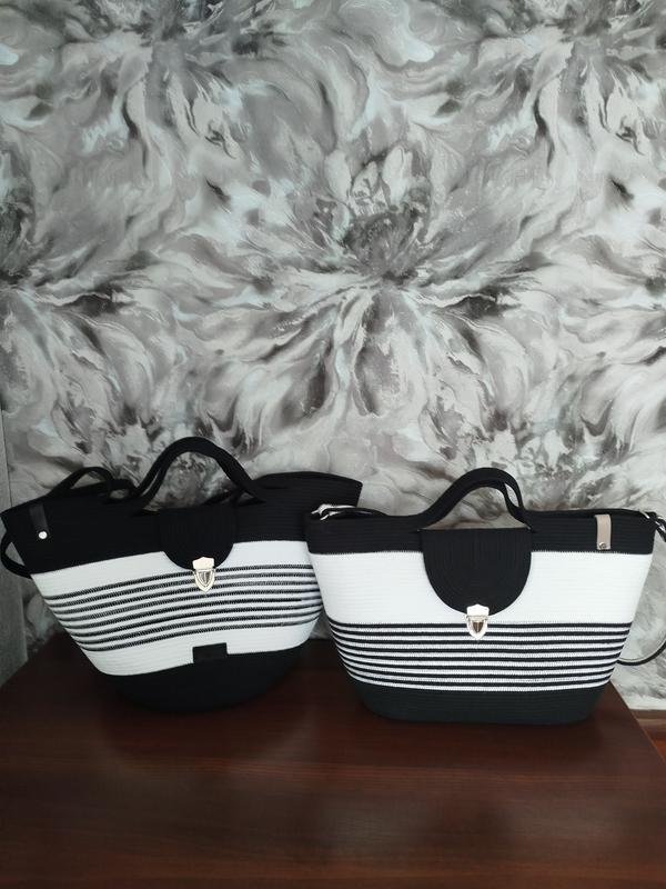Сумка-шопер великого розміру пошита з натурального бавовняного шнура,має малі та великі ручки,всередині має кишеню на блискавці та підкладку.Сумка застібається на металевий замок. Розміри 25*43*10 см. Довжина ремінця 105 см