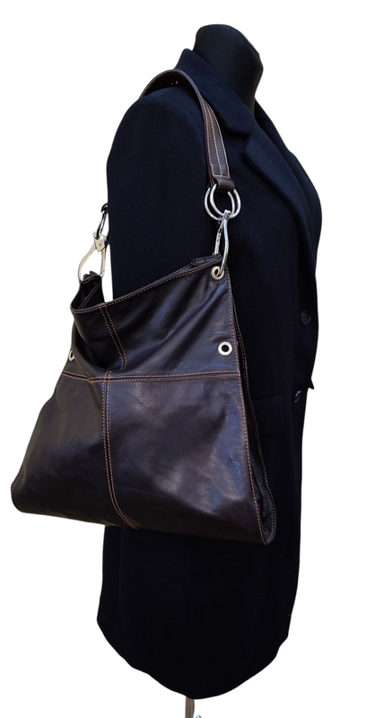 Качественная, легкая, с отличной фурнитурой сумка. Размер моделируется благодаря ручке. Шоколадный современный цвет. Полная длина 40см, ширина 37см (с боками ширина 45см).