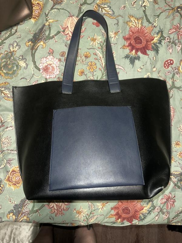 Сумка шопер чорна з темно синіми вставками . Е дві подряпинки на розі та всередині е подряпинки на фото видно . Шопер круто тримає свою форму і дуже універсальний