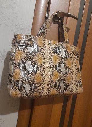 Эффектный шоппер, супер легкий, практичный, удобный. Имитация лазерной кожи. Изготовлен из полиуретанового волокна. Вмещает формат А4, есть возможность увеличить объем за счет боковых кнопок. Застегивается на магнитную кнопку. Дно не плотное, как и сама сумка, но форму держит. Недостатки на последнем фото. За счет принта малозаметны. Среда в идеальном состоянии. Фурнитура тоже, работает исправно.