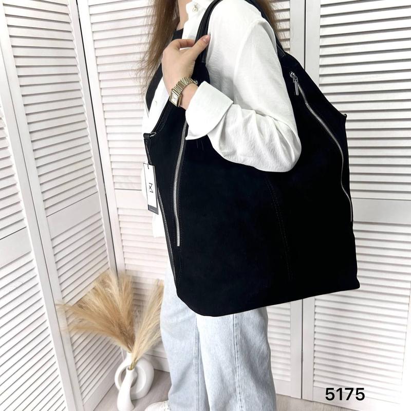 Натуральная замша в сочетании с эко кожей Размеры: Высота по центру-32 см Ширина- 43 см Дно - 13 см Длинный регулируемый ремешок Сумка имеет два отделения, между ними карман перегородка на молнии. Внутри- два кармана открыты и еще один на молнии. С тыльной стороны и спереди- карманы на молнии.