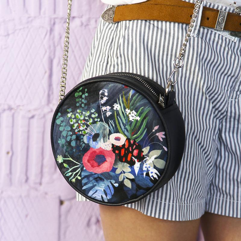 Сумка круглая tablet боди кросс на плечо на цепочке черная с цветочным принтом