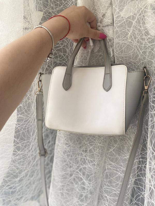 Біло-сіра сумочка з короткими ручками (є ще довгий ремінець). Без нюансів. Замочок працює добре. Розмір - 25/15