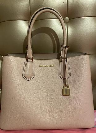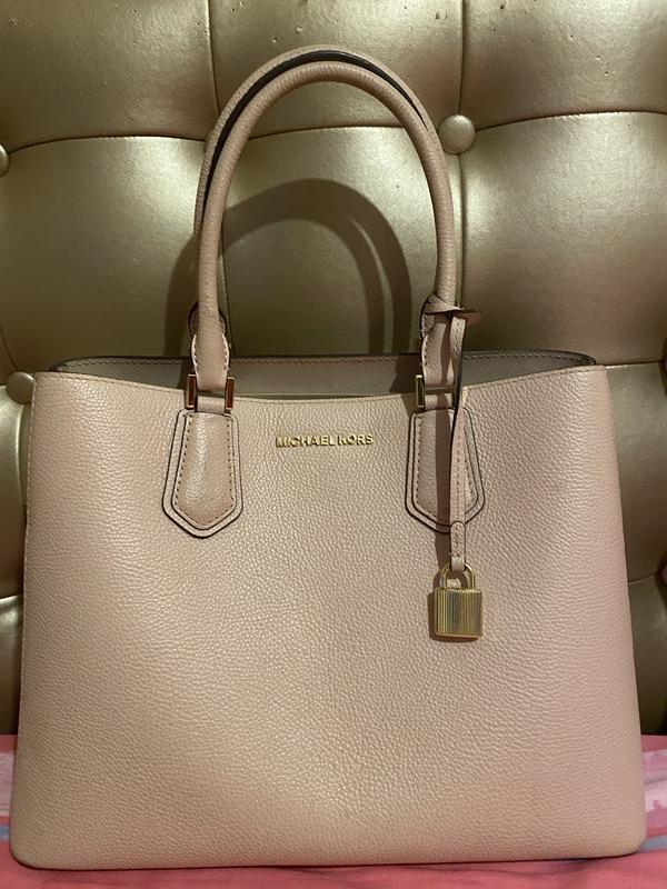 Сумка Michael Kors Mercer Large Saffiano кожаная сумка с золотистой фурнитурой. Цвет - розовый (soft pink) Материал - 100% кожа саффьяно Размер - Large 31.8 *24.8 *14 см Съемный регулируемый плечевой ремень. Внутри центральное отделение на молнии, в котором один карман на молнии. В носке была мало по фото видно, есть маленький ньюанс на уголке в цене учтено. Внутри чистая. Есть кошелек такого же цвета новый