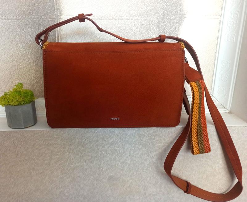 Сумка терракотового цвета имеет 2 ремня, можно использовать как клатч. Материал замш, подкладки полиэстер. Три отделения, есть незаметный нюанс на последнем фото.(устраняется путем перестегивания ремня)
