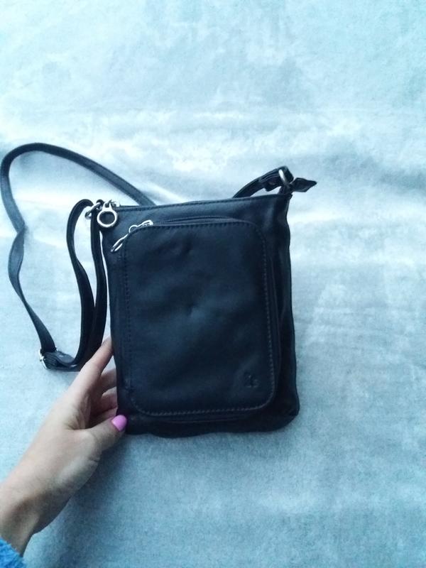 сумка бу в доброму стані. Невелика ,зручна ,має багато відділень. В одному відділенні для візиток , копійок та фото. Інше глибоке з двома карманчиками. З іншої сторони також карман з замочком. Шлейка регулюється. Верх шкіра. Розмір 17см верх ширина висота 21см
