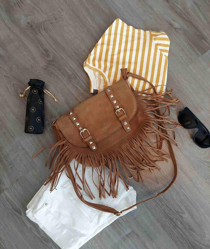 Сумочка з бахромою Закривається на кнопку і замок. В середині одне велике відділення, один карман на замку і два маленькі бокові також є невелика кишеня заді. Сумка на ремінчику довжину якого можна легко регулювати. З недоліків є невеликі потертості біля кнопки, на фото видно. Хоть сумка не велика але досить вмістка. Матеріал: штучна замша. Колір: коричневий Ціна: 130 грн