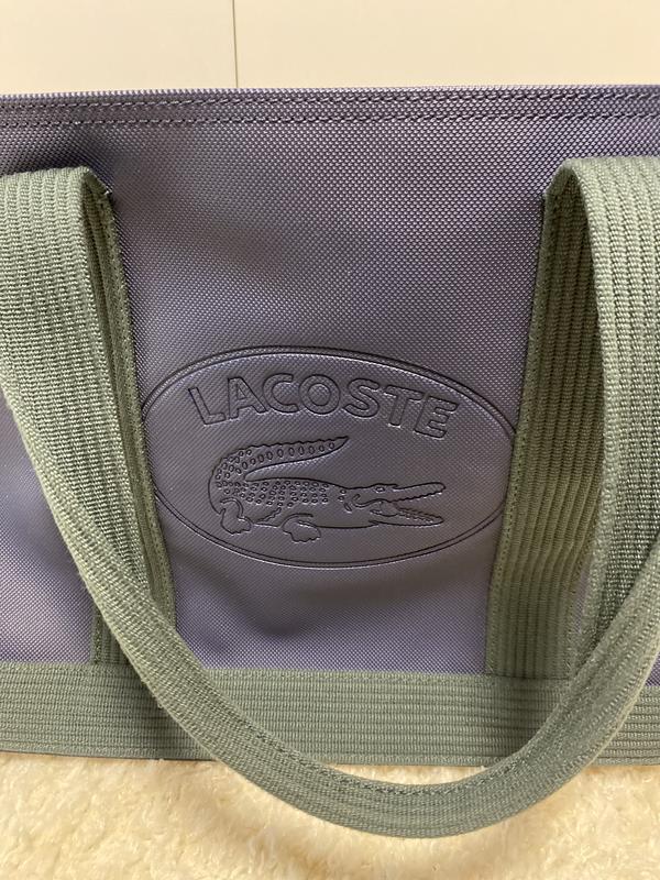 Сумка жіноча Lacoste Оригінал. Колір: синьо-зелена. Прорезинова, відбиває вологу. Тканинні міцні ручки. Ширина 43 см Висота 26 см Глибина 7 см Довжина ручок 18,5 см Всередині одна внутрішня кишеня на блискавці і ще дві невеликі кишені. В ідеальному стані