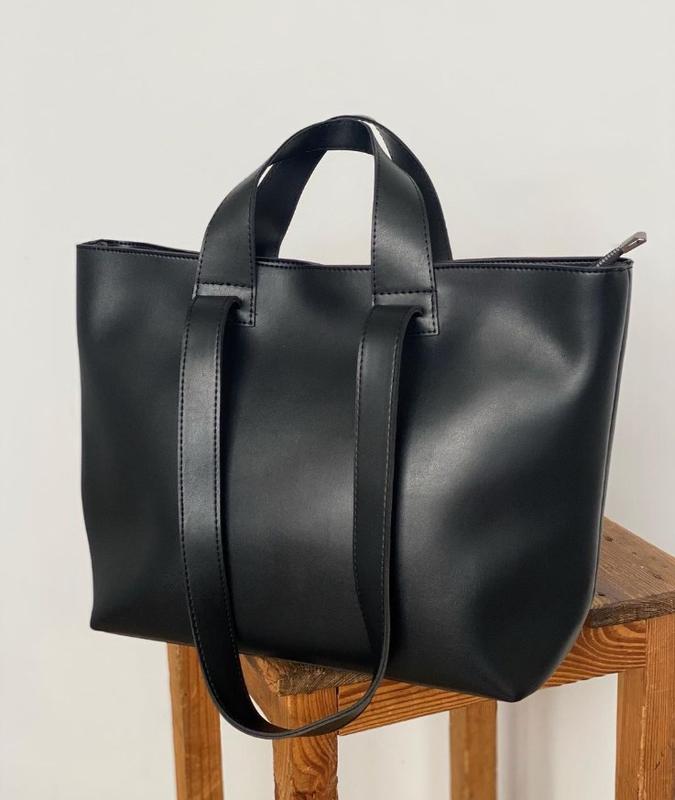 "Сумка шоппер з чорною фурнітурою Турецька зерниста екошкіра. Ширина по дну 34 см. Ширина вгорі 44 см. Висота 30 см. Дно 15 см. Висота довгих ручок 30 см. Одне відділення на блискавці, поділене навпіл перегородкою на блискавці. Всередині відкрита кишеня і кишеня на блискавці. З боків сумки карабіни для затягування куточків всередину. Над основною блискавкою кнопка. На зворотному боці кишеня на блискавці"