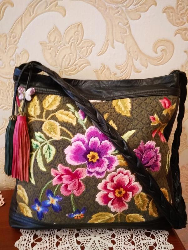 Неймовірно шикарна сумочка для тих, хто цінує якість і дизайнерські роботи. М"якенька натуральна шкіра, ручна вишивка. Колір шкіри темно-темно зелений, ближче до чорного. Розмір ширина 36см, висота 30см, ширина дна 6см, довжина ручки 82см, зстібається на замок + магнітна кнопка. Склад: Натуральна шкіра, гобелен, вишивка ручна
