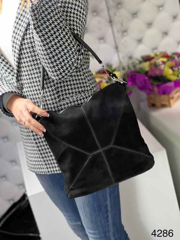 Код 4286 Натуральна замша та шкірозамінник 28х30х12 Одне відділення на блискавці, розділене відділенням на блискавці. Всередині кишені для телефона та кишеня на блискавці. На зворотному боці кишеня на блискавці. В комплекті довгий ремінь.