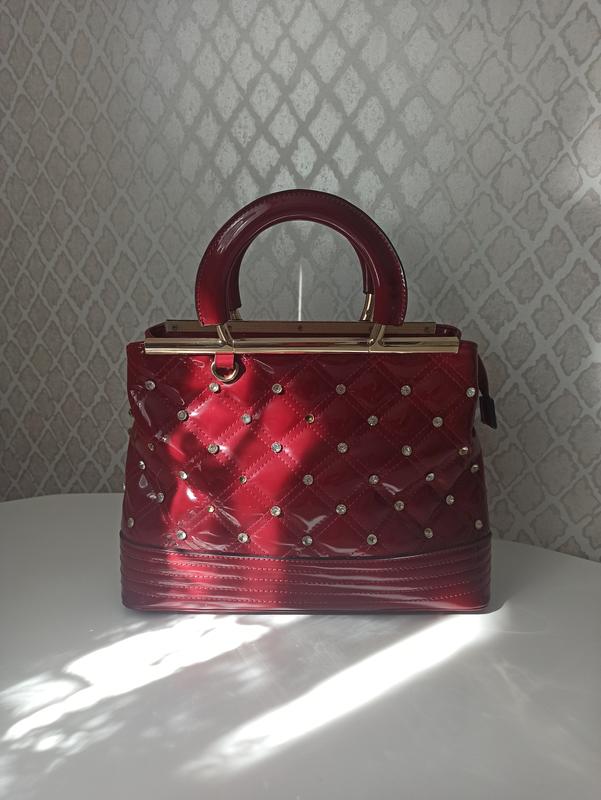 Якісна сумка із штучного лаку. Нова, у використанні не була. Відпало три камінчика, в ціні враховано. Ширина 32 см, висота до ручки 23 см, висота ручки 12 см