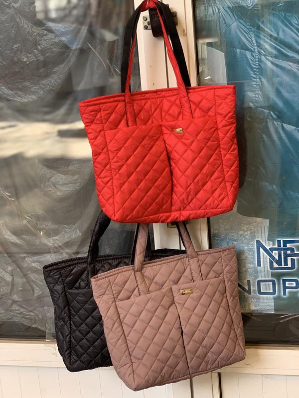 Стёганые большие сумочки в чёрном и сером цвете; Внутри одно большое отделение; Спереди два открытых кармана; Две удлинённые ручки; Размер длина:36 см; ширина:9 см; высота:36 см; Цвет чёрный,серый,синий;