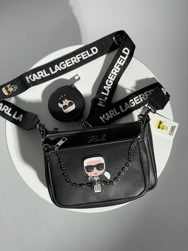 👜 Karl Lagerfeld Pochette Black (Арт: 22004) 📐 Розмір: 23 х 16 х 5 см 🧵 Матеріал: Еко Шкіра 🔎 Опис: Сумка виготовлена з чорної еко шкіри. Внутрішня підкладка із текстилю з брендуванням. Сумка з двох частин, у кожній з яких одне велике відділення (у більшій є невелика кишенька всередині). Ремінець на карабінах, шириною 5 сантиметрів і довжиною від 63 до 105 сантиметрів максимум. Також на ремінці є невеликий гаманець. Комплектується у не брендову коробку.