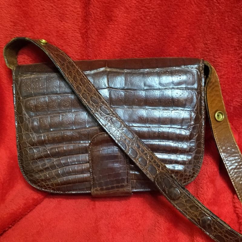 Сумка из натуральной кожи крокодила! Состояние для винтажной модели отличное! Внутри свиная кожа. Замеры: длина 24 см, глубина 14 см, длина ремешка 66 см.