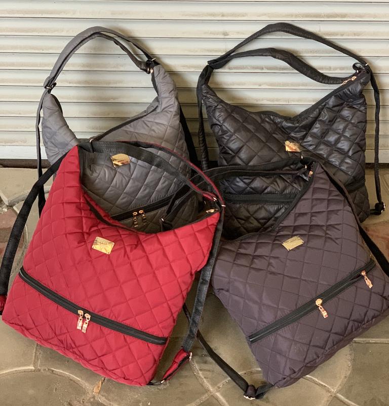 Стёганые сумки рюкзаки 🎒 Внутри одно большое отделение с открытым карманом; Спереди карман на молнии; Размер:длина:34 см ;ширина:12 см; высота:31 см; Цвета: чёрный,серый,красный,лавандово-сиреневый;