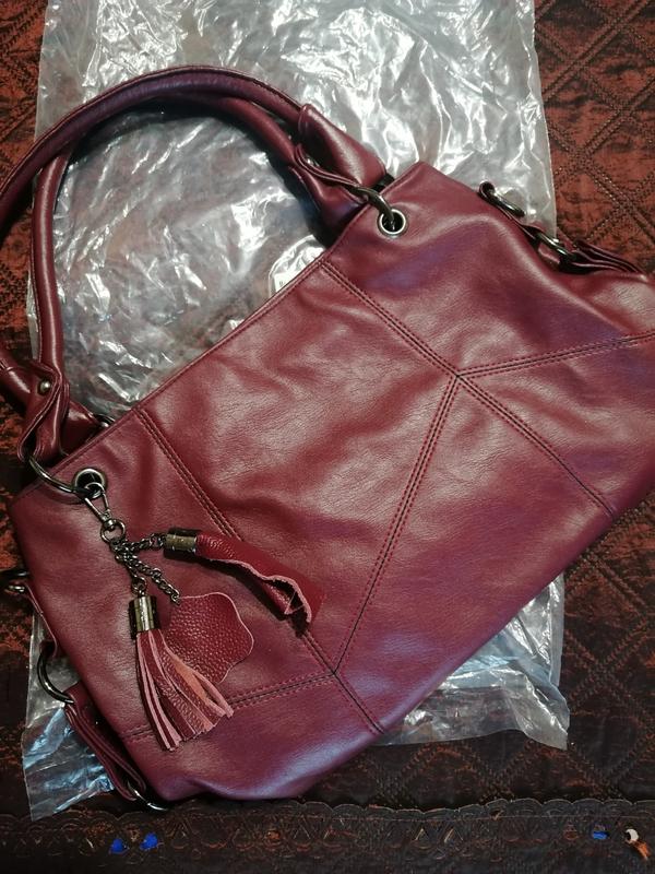 Сумка зручна, на 2 відділення, має багато карманів на молніях та довгу додаткову ручку. Колір бордо.40 на 24 см.глибина 12 см