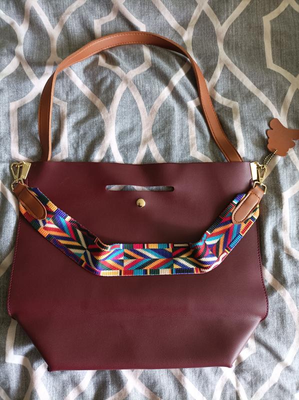 Сумка гарна, виглядає дорого та стильно Бордового кольору, ремінець коричневий короткий на плече, закріплений до сумки, не знімається також до неї йде ремінець в етно стилістиці, дуже гарно виглядає Розмір сумки 33 на 40 Без наповнення форму не тримає Закривається на кнопку, всередині має одне суцільне відділення та один карман, на фото показала)