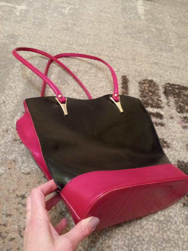 сумка італійського виробництва, стан відмінний, з дефектів чуть обтерта ручка і одна мало замітна царапина ззаду внизу (на фото показала). Всередині стан ідеальний. Має два відділення+ перегородку (на замочку, ще один відділ), дві внутрішні кишеньки. Заміри: висота 28см. ширина 10см. довжина 31см.