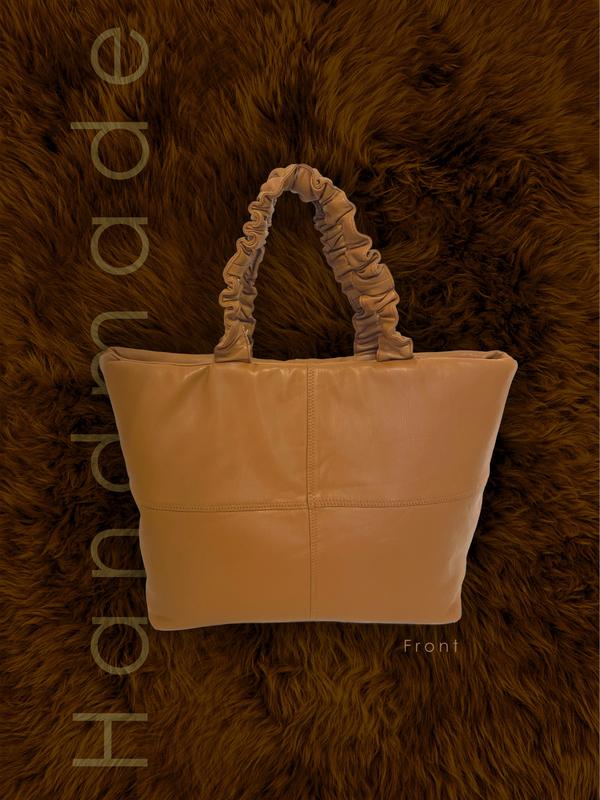 Модна сумка-дутік стане незамінною для прогулянок та походів по магазинах. Сумка зшита із штучної шкіри та поліестеру. Вона дуже зручна, тому що компактна і вмістка одночасно. Застібається на блискавку та має одне відділення та два внутрішніх кармана, один на блискавці. Розмір: 29×40 см, довжина ручок 37 см. Handmade.