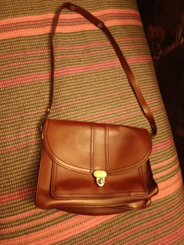 ручка на кнопках,можно делать больше,меньше,максимально 92 см,в,,ысота 21 см,ширина 28 см,внутри 3 отделения+один на замке,в очень хорошем состоянии,цвет гнилой вишни.