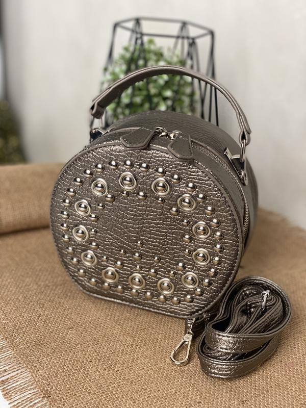 Красивая сумочка круглой формы с короткой ручкой и длинным ремнём через плечо. Диаметр 15 см, глубина 9 см. Ремень максимально 130 см регулируется. Два цвета в наличии. Арт 8354