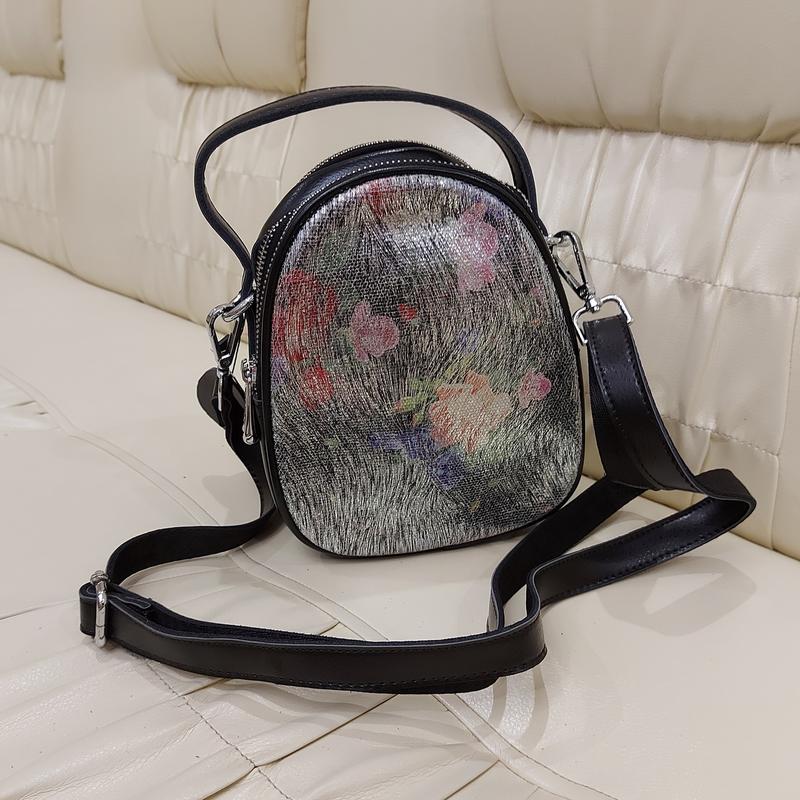 Маленькая стильная кожаная женская сумочка с цветочным принтом. Цвет черный в наличии. Натуральная кожа, мягкая и плотная, можете увидеть оригинальность кожи на пробничке. На фронте сумочки стильная цветочная выделка. Есть два больших отделения на металлических молниях с доступом в общие отделения. РАЗМЕРЫ Ширина 22 см, высота 17 см, толщина 10 см. Это та сумка, которую предпочитают стильные девушки, любящие качество и модный городской стиль.