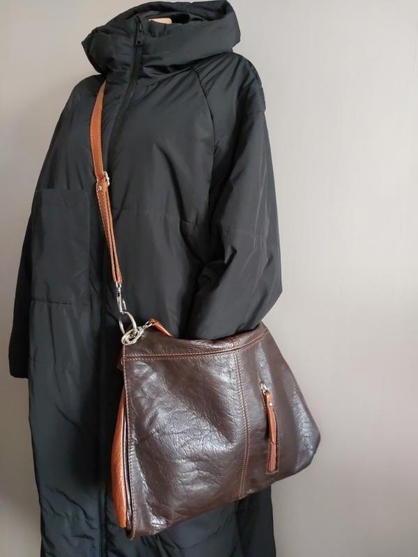 Ширина по низу 37,висота 40,робиться на висоту 28. колір тёмный шоколад зі вставками рижого,один ремінь 39 см,другий 117,регулюється.