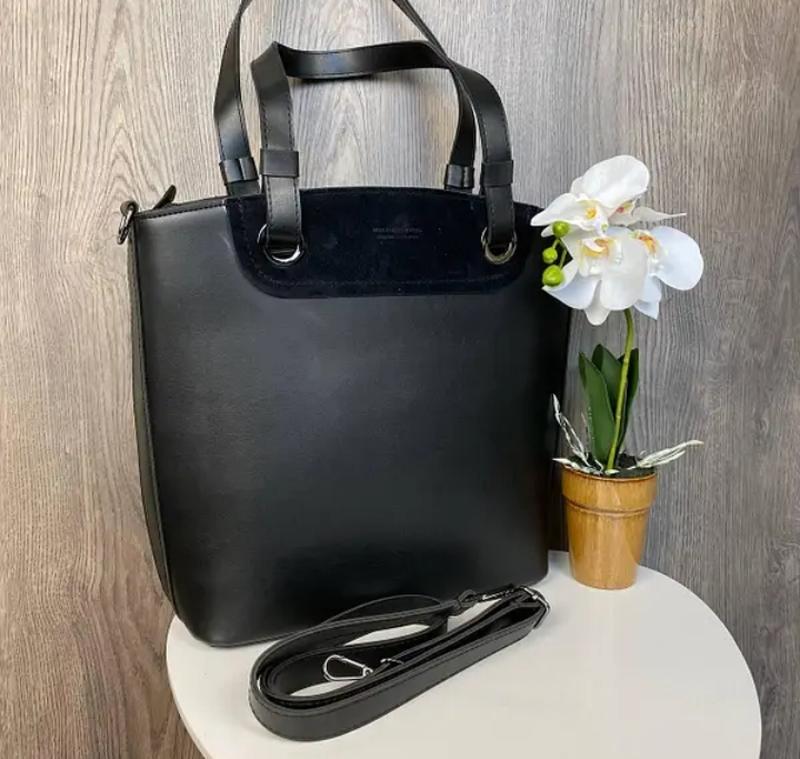 Качественная женская замшевая сумка через плечо Характеристики: Материал: натуральная замша + экокожа премиум качества (содержит форму); Длина: 35 см; Ширина за основою: 14 см; Высота: 24 см; Плечевой ремень съемный, на карабинах, входит в комплект;