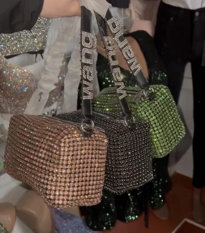 Сумка в камінцях Wang Код 7784 Кольори : чорна, зелена, золота На короткій ручці букви Wang. Довгий ланцюжок в комплекті не йде. В комплекті запасні стразы. Великий відділ на блискавці, є два маленькі відділи для карток. Розміри 19*9*8см Країна виробник Китай🇨🇳
