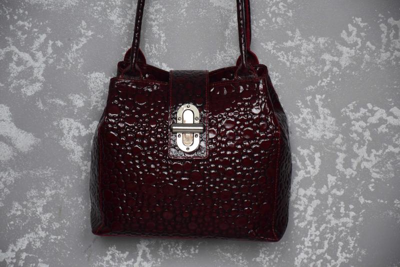 Сумка женская кожаная брендовая стильная Vera Pelle. Оригинальный! В идеальном состоянии. Женская сумка из качественной натуральной лаковой кожи с тиснением. Вишневая женская сумка Vera Pelle привлекает внимание с первого взгляда своим уникальным дизайном. Компактная, стильная и практичная сумка! Выглядит классно и дорого. Несмотря на то, что сумка небольшая, она достаточно вместительная. Внутри тканевая подкладка имеет два основных отделения, перегородку на молнии, потайной карман на молнии для мелочей. Сумочку можно носить как в руке, так и на плече. Универсальная модель, идеальная для любой ситуации. Застежка: Молния, заклепка. Замеры: Ширина: 26.5 см Высота: 25 см Глубина: 12 см Длина ручек: 64 см. Сделано в Италии. Обращайтесь: Нуль 98 25 70 926. 5f17