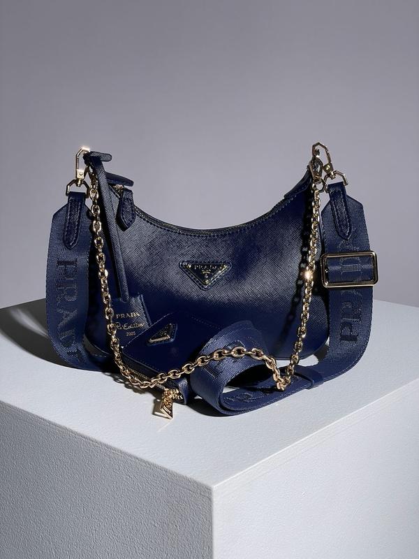 👜 Prada Re-Edition 2005 Blue Saffiano Leather Bag (Арт: 05052) 📐 Размер: 28 х 16 х 7 см 🧵 Материал: Эко Кожа 🔎 Описание: Сумка выполнена из синей эко кожи. Внутри одно сплошное отделение с брендовым металлическим логотипом. Подкладка внутри сумки из черного текстиля с фирменными надписями. Ремешок из качественного текстиля, с фирменными надписями, регулируемой длины. На ремешке есть также небольшой кармашек для мелочи. Также есть золотая цепочка на карабинах. Комплектуется в брендированной коробке и бумаге (за дополнительную плату можно приобрести фирменный пакет, пыльник и документы).