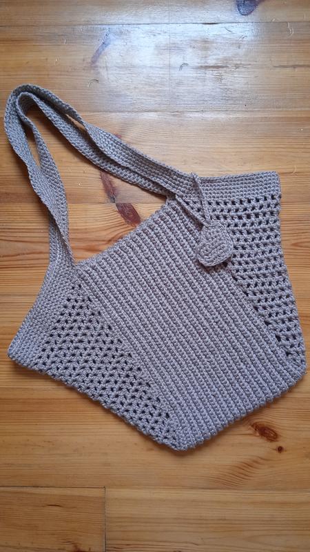 Сумка связана крючком из хлопковой ленточной нити.По бокам сеточка.Ширина снизу 17 см, сверху примерно 40см с сеточкой.Высота 26см.Ручная работа