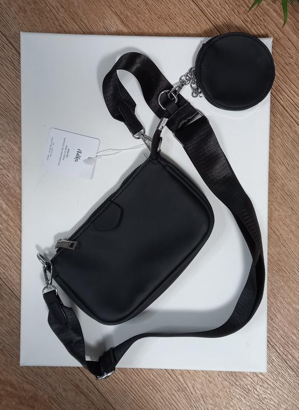 Маленькая черная сумочка через плечо. Материал искусственная кожа Размер ширина:19см, глубина 3см, высота 11,5см диаметр брелка-манца 9см