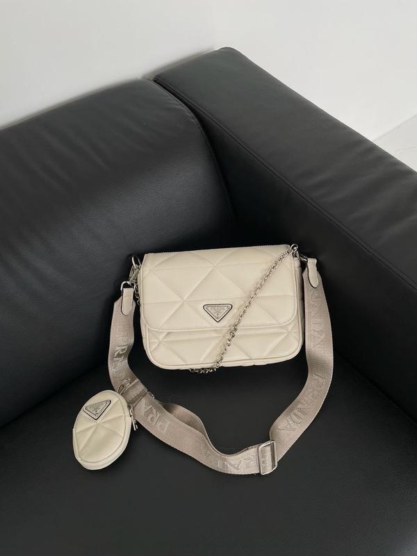 👜 Prada Re-Nylon Padded Shoulder Cream (Арт: 05024) 💵 Ціна: 1490 грн 📐 Розмір: 24 х 16 х 7 см 🧵 Матеріал: Еко Шкіра 🔎 Опис: Сумка виготовлена з еко-шкіри, простроченої. Усередині одне велике відділення та маленька кишенька на блискавці. Підкладка всередині текстильна сумка, з логотипами Prada. На ремінці є невеликий гаманець на блискавці. Є довгий ремінець на карабінах, так само декоративний ланцюжок. Комплектується в брендовану коробку та папір (за додаткову плату можна придбати фірмовий пакет, пильовик та документи).