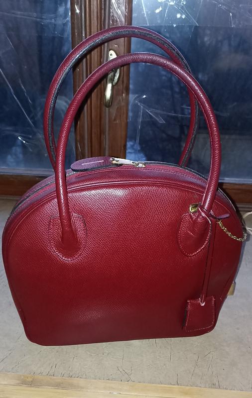 Дуже красива сумка найвищої якості виконання,, стан ідеальний ніяких пошкоджень, всередині обшита чорною шкірою, має одне відділення , та 2 кармани, одне з ,яких на замочку . склад 100% натуральна шкіра. Гарно тримає форму, красивий колір, розміри ширина верх 27 та низ. 23, висота 22 та з ручками 35, глибина низ 8,5 та верх 5,5, є довга ручка- ланцюжок.який легко від'єднати.Колір винний, дуже красивий .