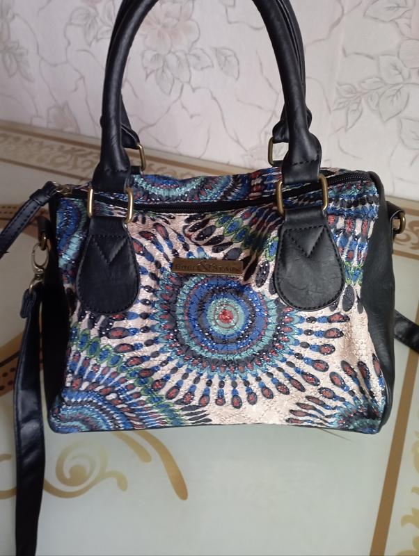 Стильная фирменная сумка, качественная экокожа+ текстиль, в идеальном состоянии, носить можно на плечо/ через плечо, в руке/ на руке, очень содержимое и функциональное. Размер: 23*25*15, длина ремешка 125, регулируется, высота ручек 17.