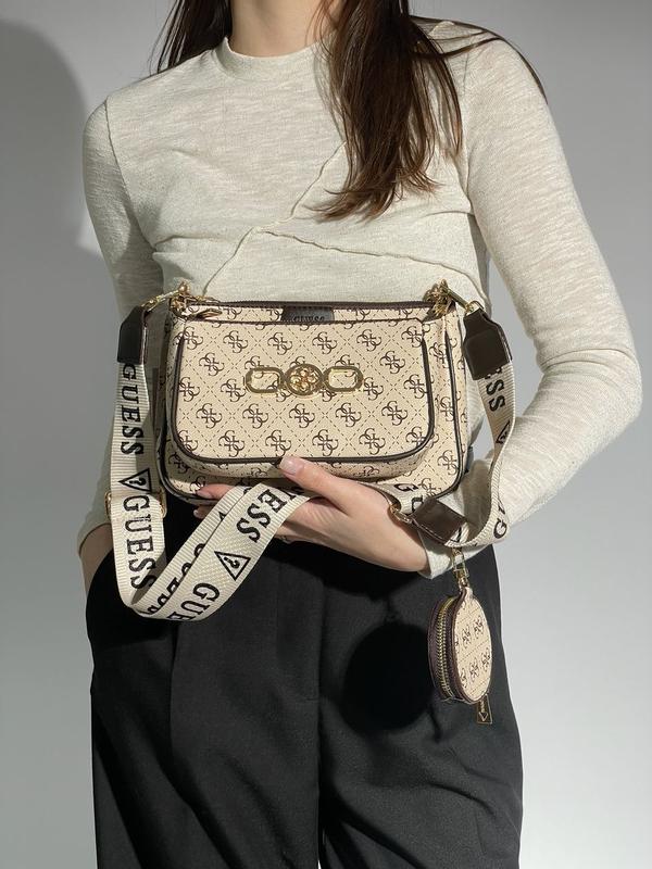 👜 Guess Pochette Multi Cream (Арт: 17097) 📐 Размер: 23 х 16 х 5 см 🧵 Материал: Эко Кожа 🔎 Описание: Сумочка выполнена из экокожи с фирменной канвой. Сумка из двух частей, в каждой из которых одно большое отделение (преимущественно есть также небольшой кармашек внутри). Декоративная цепочка на карабинах из легковесного металла. Внутренняя подкладка из плотного текстиля. Ремень из текстиля регулируется от 82 сантиметров до 117 см. Также на поясе есть небольшой круглый кошелек на молнии для различной мелочи. Комплектуется в брендированной коробке и брендированной бумаге (по дополнительной плате можно приобрести пакет, пыльник и документы).