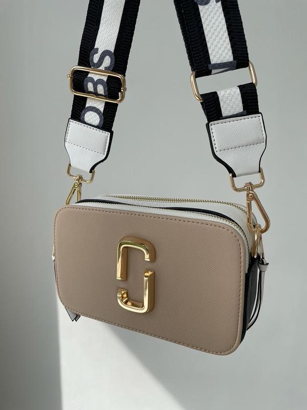 Сумка выполнена из эко кожи и текстиля, логотип металлический. Внутри два небольших отделения, разделены между собой стенкой из эко кожи. На задней стенке сумки есть небольшой кармашек. Ремешок Marc Jacobs на карабинах, шириной в 5 сантиметров и длинной от 63 до 105 сантиметров максимум. Комплектуются в не брендированных коробках.