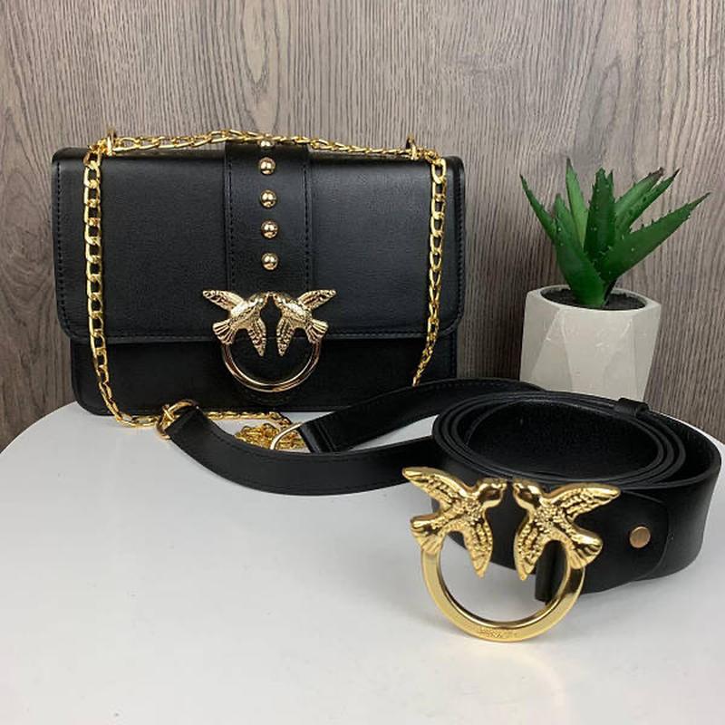 Женская сумочка клатч птички пинко черная + женский кожаный ремень pinko 2 в 1 набор