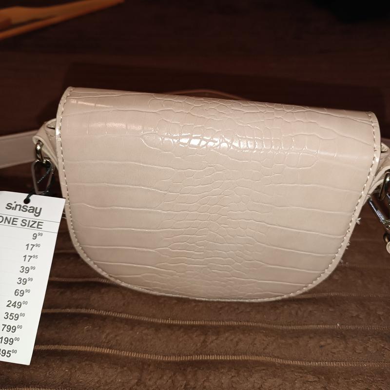 Новая женская сумочка с биркой, Sinsay, бежевого цвета, тиснение типа "крокодиловая кожа". Широкий ремешок, который регулируется. Застегивается на кнопку. Внутри один внутренний карманчик на замочке. Замеры: ширина 18.5см высота - 15см. товщина - 6 см. длина ремешка 120см.