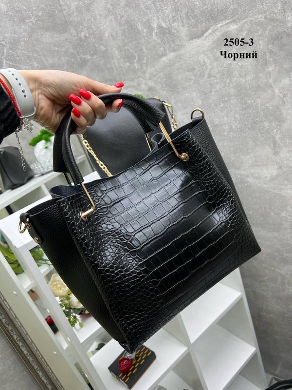 🔥🔥🔥В НАЯВНОСТІ🔥🔥🔥 Код 2505-3. Комплект: сумка + клатч. Эко кожа крото + кожзаменитель. 26 см ширина по дну. 31 см ширина вверху.25 см высота. 15 см глубина. Длина ремешка 100 см. Одно отделение на молнии, внутри клатч. Размер клатча: 18х18х10 см