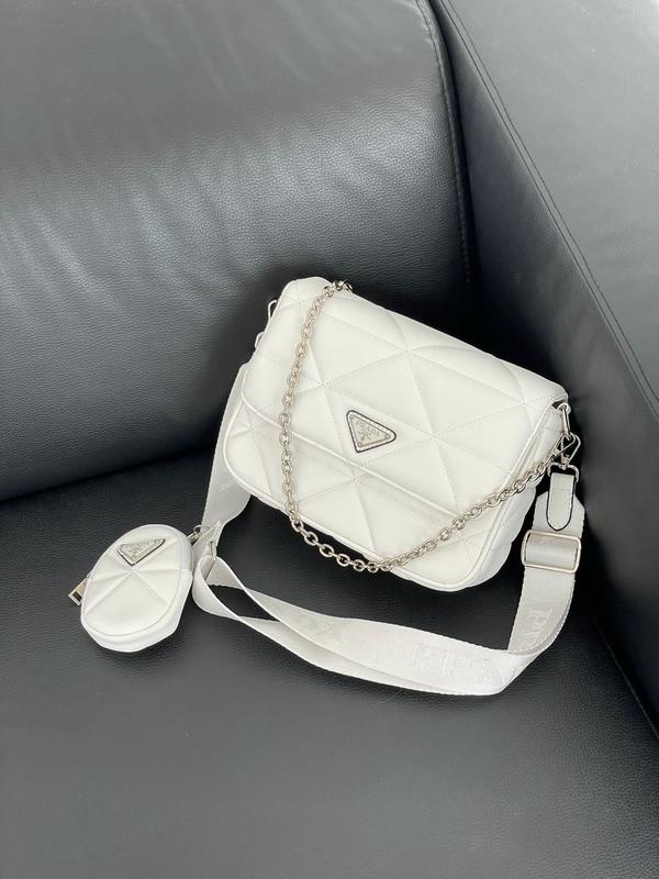 👜 Re-Nylon Padded Shoulder White 📐 Размер: 24 х 16 х 7 см 🧵 Материал: Эко Кожа 🔎 Описание: Сумка изготовлена из белой эко-кожи, простроченной. Внутри одно большое отделение и маленький кармашек на молнии. Подкладка внутри сумки текстильная, с логотипами Prada. На ремешке есть небольшой кошелек на молнии. Есть длинный ремешок на карабинах, так же декоративная цепочка. (Арт: 05021)