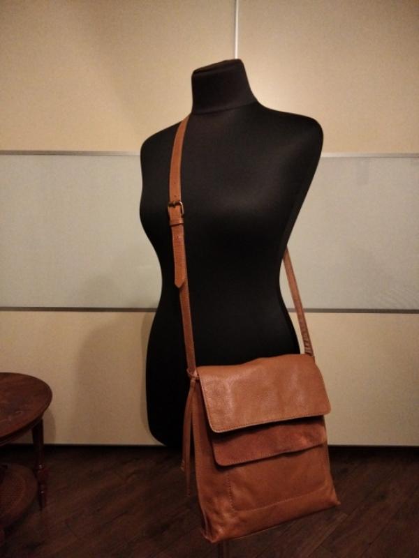 Содержание сумка из зернистой кожи и замши в красивом цвете жжонной карамели. Два отдела один на молнии застегивается, второй на кнопку. Ширина 29 см, высота 27 см, длина ручки регулируется 132 см, ширина низа сумки 6 см.