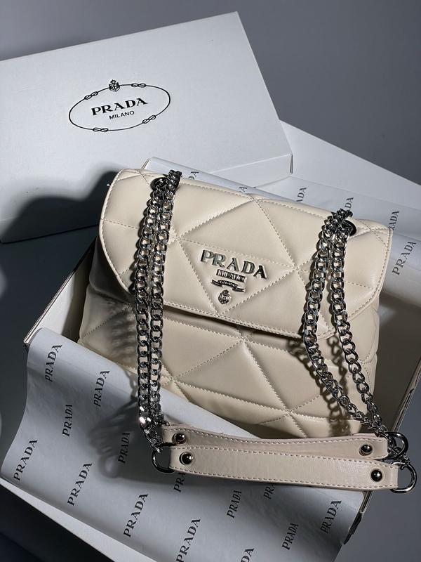 👜 Prada Nappa Spectrum Cream/Silver 📐 Размер: 25 х 18 х 9 см 🧵 Материал: Эко Кожа Сумка выполнена из гладкой экокожи, с треугольной прострочкой. Внутри два отделения, в одном из которых есть небольшой кармашек. Подкладка внутри сумки текстильная, с фирменной нашивкой. Ремешок сумки на цепочках, с ручками из эко кожи. Регулируется ремешок как под ношение в руке, так и через плечо. Комплектуется в брендированной коробке и брендированной бумаге (за дополнительную плату можно приобрести фирменный пакет, пыльник и документы).