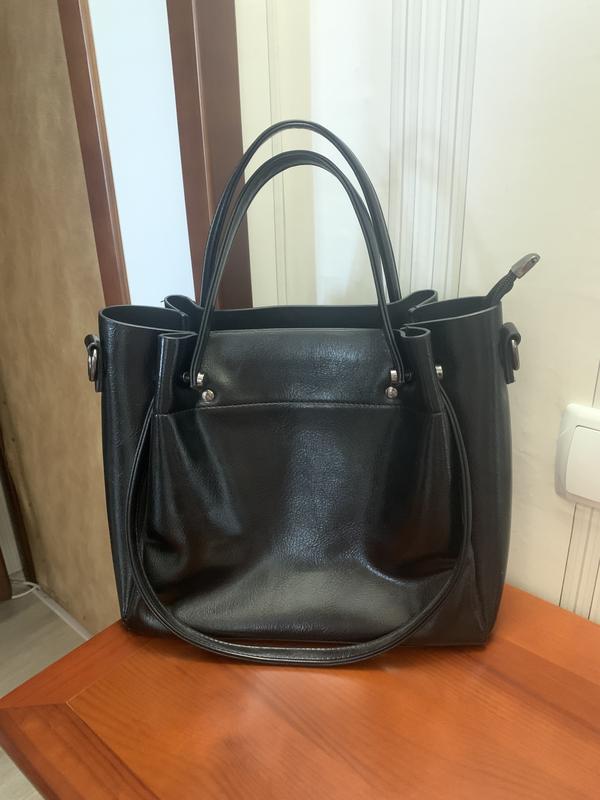 Классическая женская сумка черного цвета. Очень удобная и вместительная. Красиво подчеркнет любой образ. Имеет две пары ручек для ношения в руке и на плече.