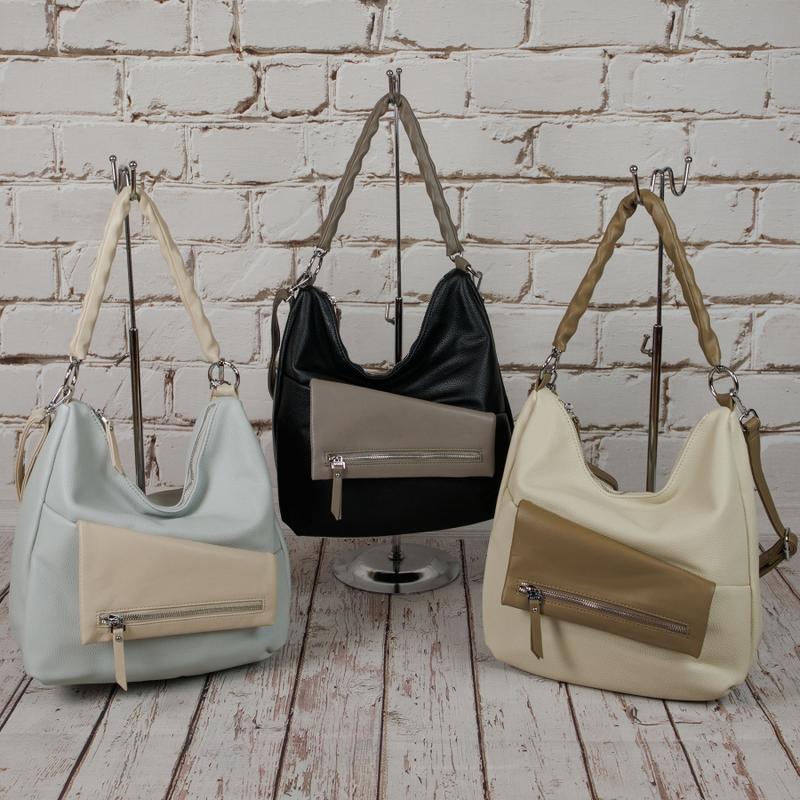 Мягкая вместительная сумка. Материал - эко кожа. Аксессуары - никелированные. Сумка закрывается на металлическую молнию. Одна средняя нерегулируемая ручка - цепочка с оплёткой из эко кожи, поэтому очень удобна на плече. Высота ручки - 36 см. Дополнительно имеется длинная регулируемая ручка. Максимальная длина ручки - 125 см. На лицевой стороне сумки расположен накладной карман с клапаном на магнитной застёжке. На задней стороне расположен горизонтальный прорезной карман на молнии.
