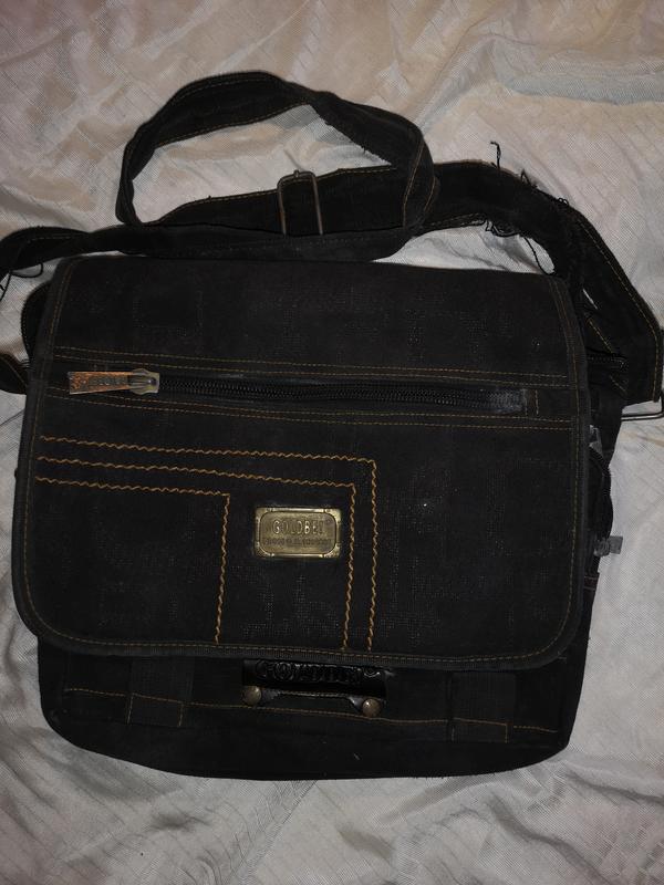 34X28 (высота),5 отделений, 2 боковых кармашка, сзади молния нерабочая. Ремень длинный, следует поменять или отрезать 30см длины посередине разорван (фото5, 6).